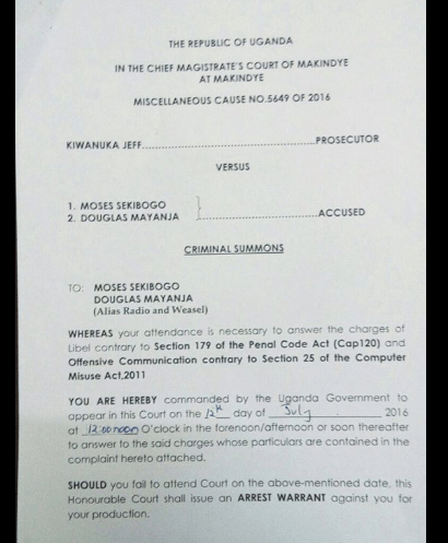 According to our close sources, Jeff through his lawyers Muwema and Company Advocates have served Radio and Weasel with a new legal note commanding them to appear in court on 12th July to answer charges of libel and if they fail to attend court, their arrest warrant will be issued.