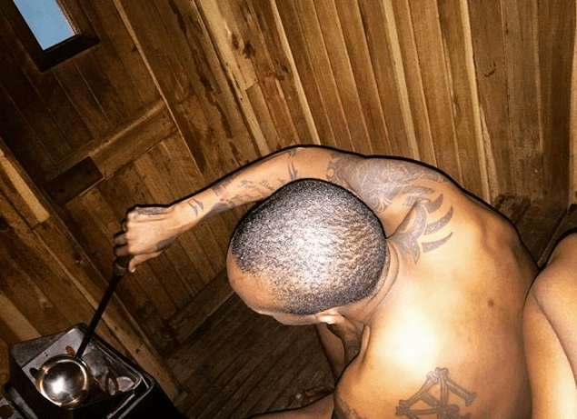 The picture shows him sitted on what seems to be a wooden bench ardoned in mostly nothing as he scoops some unidentified liquid with a ladle. Behind him, touching his back is what appears to be a folded naked leg belonging to someone else.