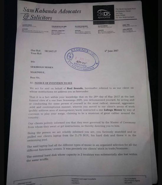We have learnt that Real Sounds through Sam Kabanda Advocates have issued a notice of intention to sue Radio for reportedly throwing a DJ’s laptop in a swimming pool during the late Ivan Ssemwanga’s vigil that was held in Muyenga on May 28. It is said that during this scuffle the deejay also lost his external hard disk that contained all his music.