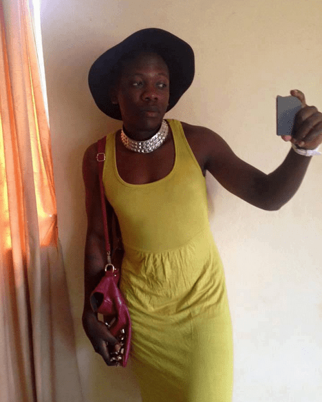 In the photo shared on social media, Geosteady is seen wearing a yellow dress and a black hat. He completes his feminine look with silver neck jewelry and a reddish handbag.