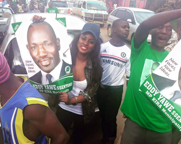 Singer Leila Kayondo has shown support for fellow singer Eddie Yawe as he campaigns for Kira municipality MP. In a rally today, Leila was seen holding Eddie Yawe’s poster as she moved along with Eddie Yawe’s crowd. Meanwhile Eddie Yawe and Leila are teaming up in a new song alongside singers Aganaga, Coco Finger and Renah.