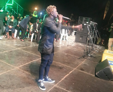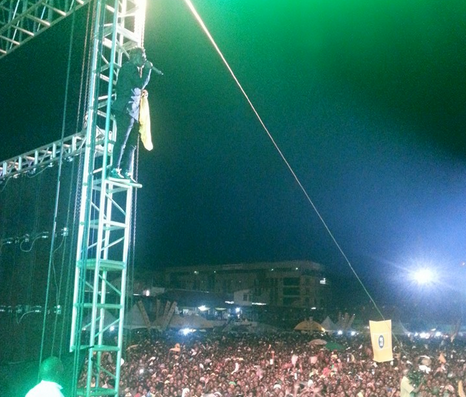 Gravity Omutujju took performing at Ekiggunda Kyo Mwaka concert to a whole new level, quite literally, after he climbed the stage frame work to entertain the mammoth crowd. The crowd seemed to love his antics as they cheered on. See the photos below.